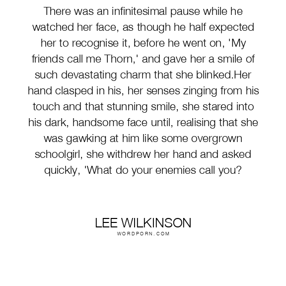 There was an infinitesimal pause while he watched her face, as though he half expected her to recognise it, before he went on, 'My friends call me Thorn,' and gave her a smile of such devastating charm that she blinked.Her hand clasped in his, her senses zinging from his touch and that stunning smile, she stared into his dark, handsome face until, realising that she was gawking at him like some overgrown schoolgirl, she withdrew her hand and asked quickly, 'What do your enemies call you?