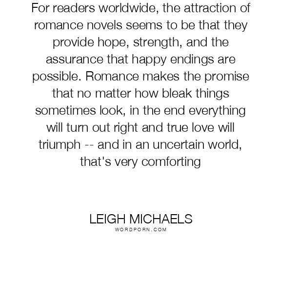 For readers worldwide, the attraction of romance novels seems to be that they provide hope, strength, and the assurance that happy endings are possible. Romance makes the promise that no matter how bleak things sometimes look, in the end everything will turn out right and true love will triumph -- and in an uncertain world, that's very comforting
