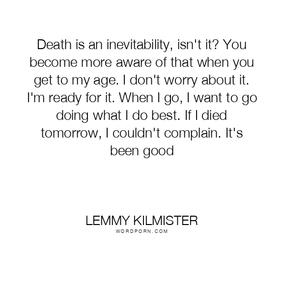 Death is an inevitability, isn't it? You become more aware of that when you get to my age. I don't worry about it. I'm ready for it. When I go, I want to go doing what I do best. If I died tomorrow, I couldn't complain. It's been good
