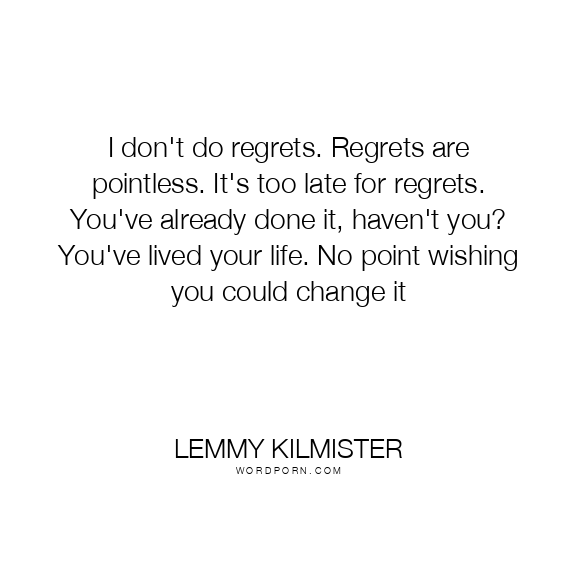 I don't do regrets. Regrets are pointless. It's too late for regrets. You've already done it, haven't you? You've lived your life. No point wishing you could change it
