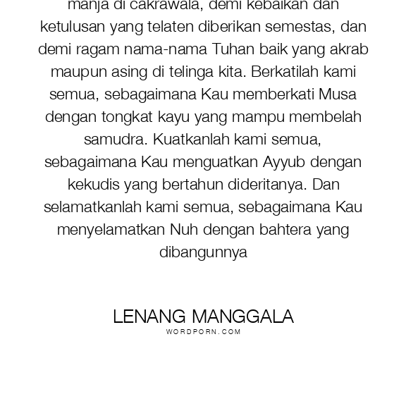 Demi matahari senja yang menggantung manis manja di cakrawala, demi kebaikan dan ketulusan yang telaten diberikan semestas, dan demi ragam nama-nama Tuhan baik yang akrab maupun asing di telinga kita. Berkatilah kami semua, sebagaimana Kau memberkati Musa dengan tongkat kayu yang mampu membelah samudra. Kuatkanlah kami semua, sebagaimana Kau menguatkan Ayyub dengan kekudis yang bertahun dideritanya. Dan selamatkanlah kami semua, sebagaimana Kau menyelamatkan Nuh dengan bahtera yang dibangunnya