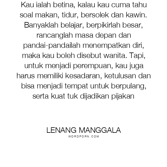 Kau ialah betina, kalau kau cuma tahu soal makan, tidur, bersolek dan kawin. Banyaklah belajar, berpikirlah besar, rancanglah masa depan dan pandai-pandailah menempatkan diri, maka kau boleh disebut wanita. Tapi, untuk menjadi perempuan, kau juga harus memiliki kesadaran, ketulusan dan bisa menjadi tempat untuk berpulang, serta kuat tuk dijadikan pijakan