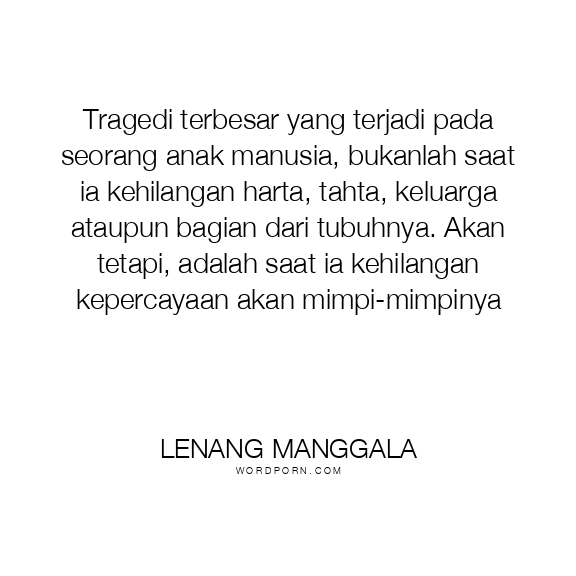 Tragedi terbesar yang terjadi pada seorang anak manusia, bukanlah saat ia kehilangan harta, tahta, keluarga ataupun bagian dari tubuhnya. Akan tetapi, adalah saat ia kehilangan kepercayaan akan mimpi-mimpinya