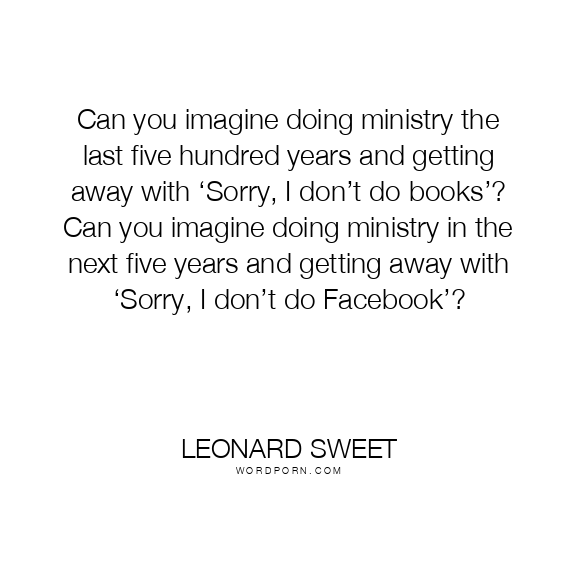 Can you imagine doing ministry the last five hundred years and getting away with ‘Sorry, I don’t do books’? Can you imagine doing ministry in the next five years and getting away with ‘Sorry, I don’t do Facebook’?