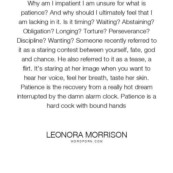 Why am I impatient I am unsure for what is patience? And why should I ultimately feel that I am lacking in it. Is it timing? Waiting? Abstaining? Obligation? Longing? Torture? Perseverance? Discipline? Wanting? Someone recently referred to it as a staring contest between yourself, fate, god and chance. He also referred to it as a tease, a flirt. It's staring at her image when you want to hear her voice, feel her breath, taste her skin. Patience is the recovery from a really hot dream interrupted by the damn alarm clock. Patience is a hard cock with bound hands