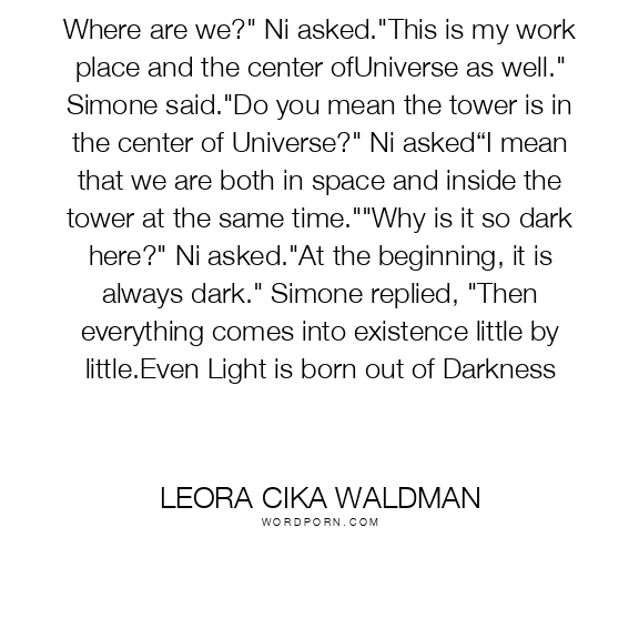 Where are we?" Ni asked."This is my work place and the center ofUniverse as well." Simone said."Do you mean the tower is in the center of Universe?" Ni asked“I mean that we are both in space and inside the tower at the same time.""Why is it so dark here?" Ni asked."At the beginning, it is always dark." Simone replied, "Then everything comes into existence little by little.Even Light is born out of Darkness