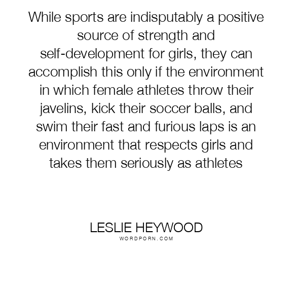 While sports are indisputably a positive source of strength and self-development for girls, they can accomplish this only if the environment in which female athletes throw their javelins, kick their soccer balls, and swim their fast and furious laps is an environment that respects girls and takes them seriously as athletes