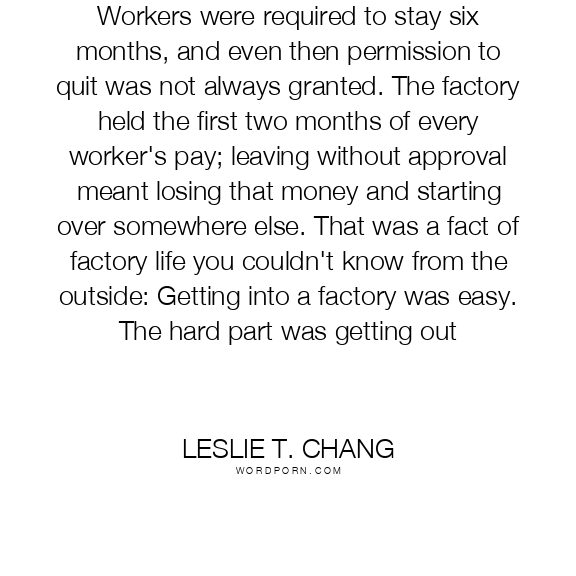 Workers were required to stay six months, and even then permission to quit was not always granted. The factory held the first two months of every worker's pay; leaving without approval meant losing that money and starting over somewhere else. That was a fact of factory life you couldn't know from the outside: Getting into a factory was easy. The hard part was getting out