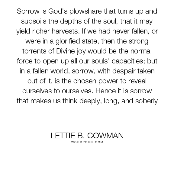 Sorrow is God's plowshare that turns up and subsoils the depths of the soul, that it may yield richer harvests. If we had never fallen, or were in a glorified state, then the strong torrents of Divine joy would be the normal force to open up all our souls' capacities; but in a fallen world, sorrow, with despair taken out of it, is the chosen power to reveal ourselves to ourselves. Hence it is sorrow that makes us think deeply, long, and soberly