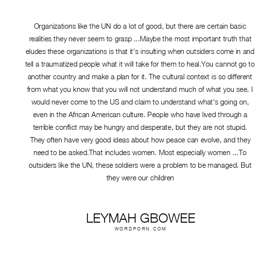 Organizations like the UN do a lot of good, but there are certain basic realities they never seem to grasp ...Maybe the most important truth that eludes these organizations is that it's insulting when outsiders come in and tell a traumatized people what it will take for them to heal.You cannot go to another country and make a plan for it. The cultural context is so different from what you know that you will not understand much of what you see. I would never come to the US and claim to understand what's going on, even in the African American culture. People who have lived through a terrible conflict may be hungry and desperate, but they are not stupid. They often have very good ideas about how peace can evolve, and they need to be asked.That includes women. Most especially women ...To outsiders like the UN, these soldiers were a problem to be managed. But they were our children