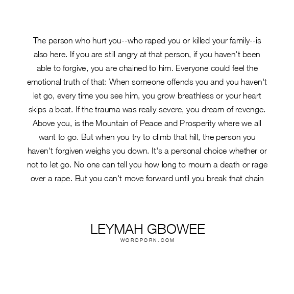 The person who hurt you--who raped you or killed your family--is also here. If you are still angry at that person, if you haven't been able to forgive, you are chained to him. Everyone could feel the emotional truth of that: When someone offends you and you haven't let go, every time you see him, you grow breathless or your heart skips a beat. If the trauma was really severe, you dream of revenge. Above you, is the Mountain of Peace and Prosperity where we all want to go. But when you try to climb that hill, the person you haven't forgiven weighs you down. It's a personal choice whether or not to let go. No one can tell you how long to mourn a death or rage over a rape. But you can't move forward until you break that chain