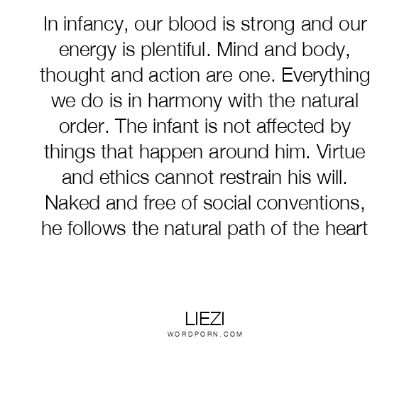 In infancy, our blood is strong and our energy is plentiful. Mind and body, thought and action are one. Everything we do is in harmony with the natural order. The infant is not affected by things that happen around him. Virtue and ethics cannot restrain his will. Naked and free of social conventions, he follows the natural path of the heart