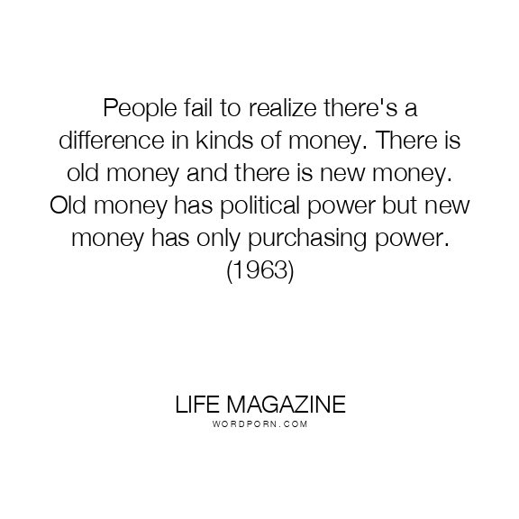 People fail to realize there's a difference in kinds of money. There is old money and there is new money. Old money has political power but new money has only purchasing power. (1963)