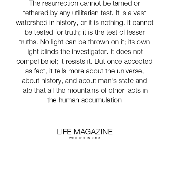 The resurrection cannot be tamed or tethered by any utilitarian test. It is a vast watershed in history, or it is nothing. It cannot be tested for truth; it is the test of lesser truths. No light can be thrown on it; its own light blinds the investigator. It does not compel belief; it resists it. But once accepted as fact, it tells more about the universe, about history, and about man's state and fate that all the mountains of other facts in the human accumulation
