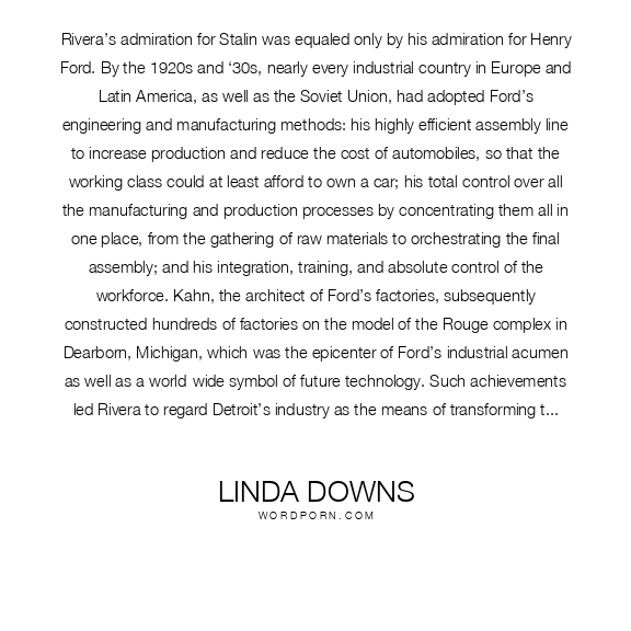 Rivera’s admiration for Stalin was equaled only by his admiration for Henry Ford. By the 1920s and ‘30s, nearly every industrial country in Europe and Latin America, as well as the Soviet Union, had adopted Ford’s engineering and manufacturing methods: his highly efficient assembly line to increase production and reduce the cost of automobiles, so that the working class could at least afford to own a car; his total control over all the manufacturing and production processes by concentrating them all in one place, from the gathering of raw materials to orchestrating the final assembly; and his integration, training, and absolute control of the workforce. Kahn, the architect of Ford’s factories, subsequently constructed hundreds of factories on the model of the Rouge complex in Dearborn, Michigan, which was the epicenter of Ford’s industrial acumen as well as a world-wide symbol of future technology. Such achievements led Rivera to regard Detroit’s industry as the means of transforming the proletariat to take the reins of economic production