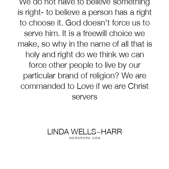 We do not have to believe something is right- to believe a person has a right to choose it. God doesn't force us to serve him. It is a freewill choice we make, so why in the name of all that is holy and right do we think we can force other people to live by our particular brand of religion? We are commanded to Love if we are Christ servers