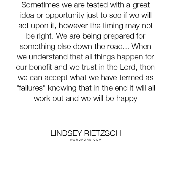 Sometimes we are tested with a great idea or opportunity just to see if we will act upon it, however the timing may not be right. We are being prepared for something else down the road... When we understand that all things happen for our benefit and we trust in the Lord, then we can accept what we have termed as "failures" knowing that in the end it will all work out and we will be happy