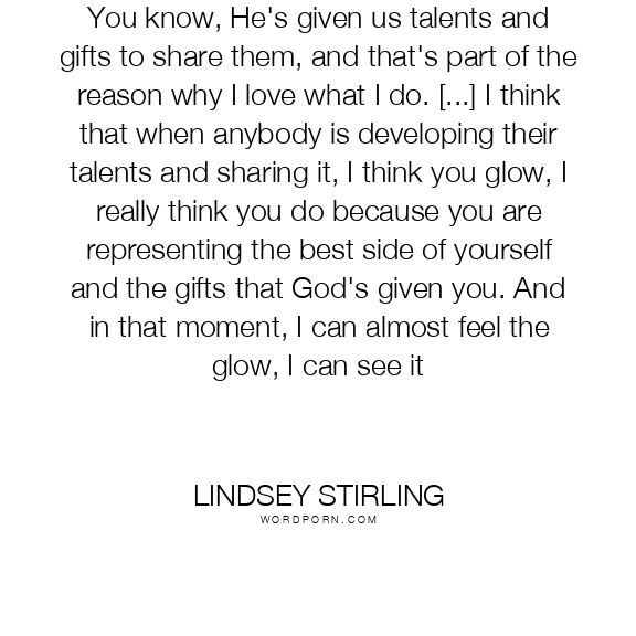 You know, He's given us talents and gifts to share them, and that's part of the reason why I love what I do. [...] I think that when anybody is developing their talents and sharing it, I think you glow, I really think you do because you are representing the best side of yourself and the gifts that God's given you. And in that moment, I can almost feel the glow, I can see it