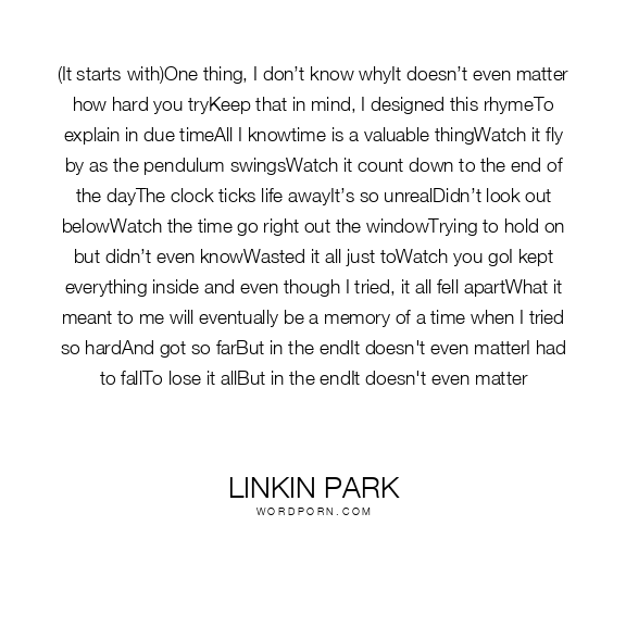 (It starts with)One thing, I don’t know whyIt doesn’t even matter how hard you tryKeep that in mind, I designed this rhymeTo explain in due timeAll I knowtime is a valuable thingWatch it fly by as the pendulum swingsWatch it count down to the end of the dayThe clock ticks life awayIt’s so unrealDidn’t look out belowWatch the time go right out the windowTrying to hold on but didn’t even knowWasted it all just toWatch you goI kept everything inside and even though I tried, it all fell apartWhat it meant to me will eventually be a memory of a time when I tried so hardAnd got so farBut in the endIt doesn't even matterI had to fallTo lose it allBut in the endIt doesn't even matter