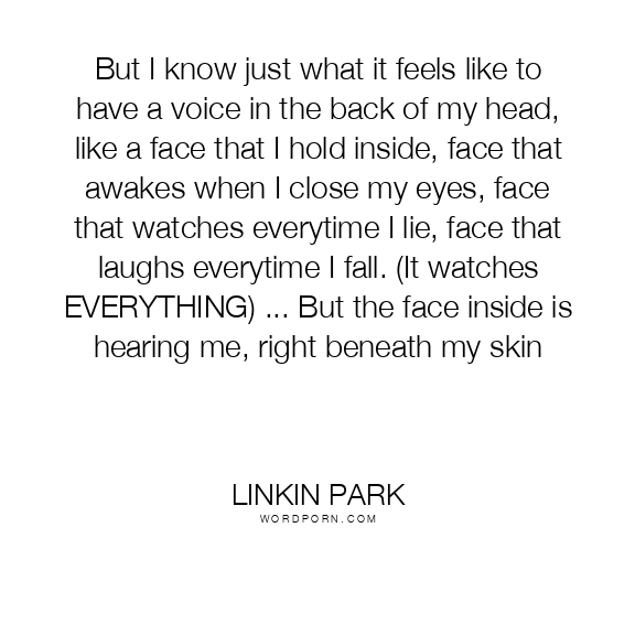 But I know just what it feels like to have a voice in the back of my head, like a face that I hold inside, face that awakes when I close my eyes, face that watches everytime I lie, face that laughs everytime I fall. (It watches EVERYTHING) ... But the face inside is hearing me, right beneath my skin
