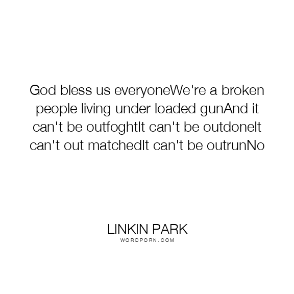 God bless us everyoneWe're a broken people living under loaded gunAnd it can't be outfoghtIt can't be outdoneIt can't out matchedIt can't be outrunNo