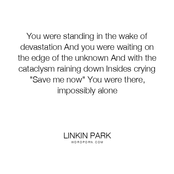 You were standing in the wake of devastation And you were waiting on the edge of the unknown And with the cataclysm raining down Insides crying "Save me now" You were there, impossibly alone