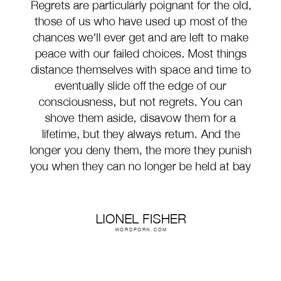 Regrets are particularly poignant for the old, those of us who have used up most of the chances we'll ever get and are left to make peace with our failed choices. Most things distance themselves with space and time to eventually slide off the edge of our consciousness, but not regrets. You can shove them aside, disavow them for a lifetime, but they always return. And the longer you deny them, the more they punish you when they can no longer be held at bay