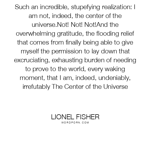 Such an incredible, stupefying realization: I am not, indeed, the center of the universe.Not! Not! Not!And the overwhelming gratitude, the flooding relief that comes from finally being able to give myself the permission to lay down that excruciating, exhausting burden of needing to prove to the world, every waking moment, that I am, indeed, undeniably, irrefutably The Center of the Universe