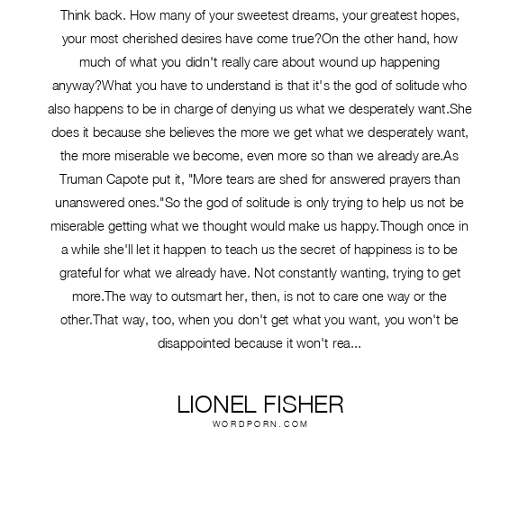 Think back. How many of your sweetest dreams, your greatest hopes, your most cherished desires have come true?On the other hand, how much of what you didn't really care about wound up happening anyway?What you have to understand is that it's the god of solitude who also happens to be in charge of denying us what we desperately want.She does it because she believes the more we get what we desperately want, the more miserable we become, even more so than we already are.As Truman Capote put it, "More tears are shed for answered prayers than unanswered ones."So the god of solitude is only trying to help us not be miserable getting what we thought would make us happy.Though once in a while she'll let it happen to teach us the secret of happiness is to be grateful for what we already have. Not constantly wanting, trying to get more.The way to outsmart her, then, is not to care one way or the other.That way, too, when you don't get what you want, you won't be disappointed because it won't really matter