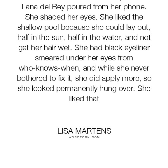 Clara smoked in the shallow pool as Lana del Rey poured from her phone. She shaded her eyes. She liked the shallow pool because she could lay out, half in the sun, half in the water, and not get her hair wet. She had black eyeliner smeared under her eyes from who-knows-when, and while she never bothered to fix it, she did apply more, so she looked permanently hung over. She liked that