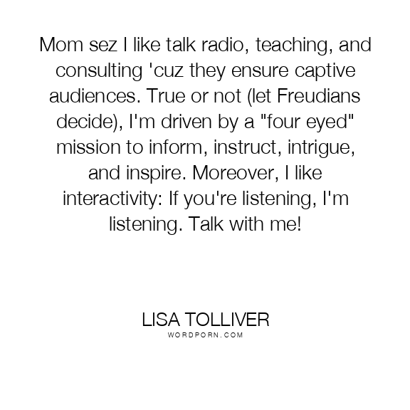 Lisa Tolliver quote. Mom sez I like talk radio, teaching, and consulting 'cuz they ensure captive audiences. True or not (let Freudians decide), I'm driven by a