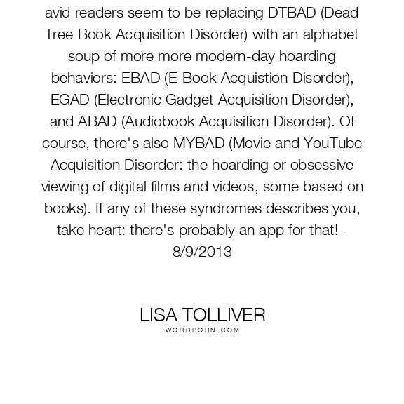Lisa Tolliver quote. Observation:Thanks to technological advances, avid readers seem to be replacing DTBAD (Dead Tree Book Acquisition Disorder) with an alphabet soup of more more modern-day hoarding behaviors: EBAD (E-Book Acquistion Disorder), EGAD (Electronic Gadget Acquisition Disorder), and ABAD (Audiobook Acquisition Disorder). Of course, there's also MYBAD (Movie and YouTube Acquisition Disorder: the hoarding or obsessive viewing of digital films and videos, some based on books). If any of these syndromes describes you, take heart: there's probably an app for that! - 8/9/2013