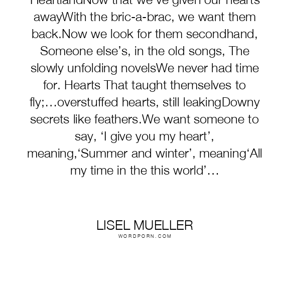 HeartlandNow that we’ve given our hearts awayWith the bric-a-brac, we want them back.Now we look for them secondhand, Someone else’s, in the old songs, The slowly unfolding novelsWe never had time for. Hearts That taught themselves to fly;…overstuffed hearts, still leakingDowny secrets like feathers.We want someone to say, ‘I give you my heart’, meaning,‘Summer and winter’, meaning‘All my time in the this world’…