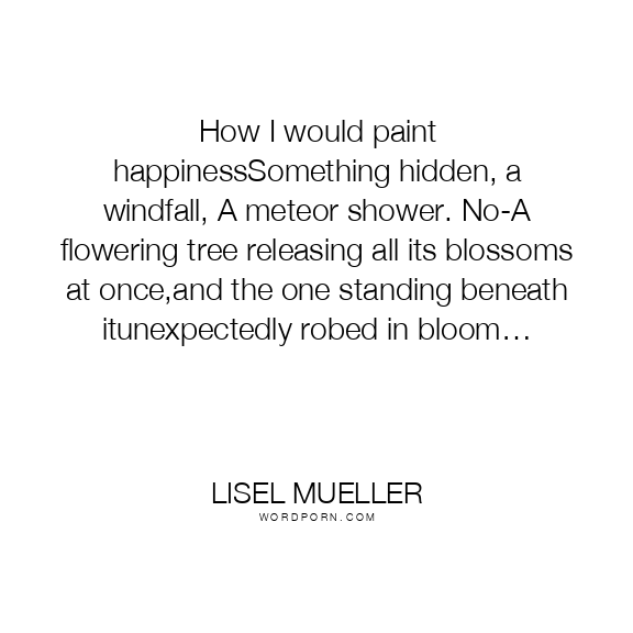 How I would paint happinessSomething hidden, a windfall, A meteor shower. No-A flowering tree releasing all its blossoms at once,and the one standing beneath itunexpectedly robed in bloom…