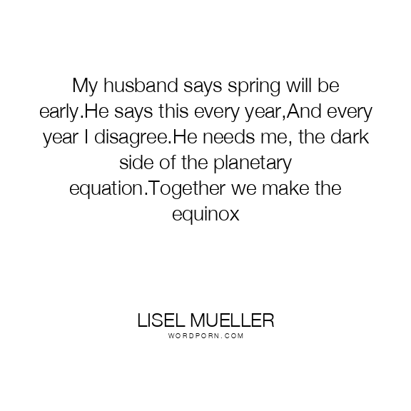 My husband says spring will be early.He says this every year,And every year I disagree.He needs me, the dark side of the planetary equation.Together we make the equinox