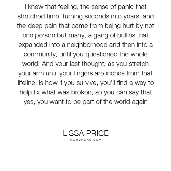 I knew that feeling, the sense of panic that stretched time, turning seconds into years, and the deep pain that came from being hurt by not one person but many, a gang of bullies that expanded into a neighborhood and then into a community, until you questioned the whole world. And your last thought, as you stretch your arm until your fingers are inches from that lifeline, is how if you survive, you'll find a way to help fix what was broken, so you can say that yes, you want to be part of the world again