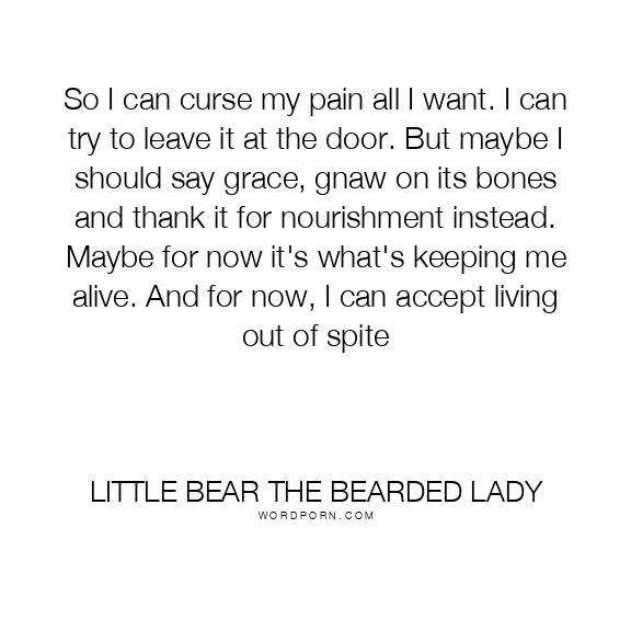 So I can curse my pain all I want. I can try to leave it at the door. But maybe I should say grace, gnaw on its bones and thank it for nourishment instead. Maybe for now it's what's keeping me alive. And for now, I can accept living out of spite