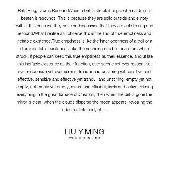 Bells Ring, Drums ResoundWhen a bell is struck it rings, when a drum is beaten it resounds. This is because they are solid outside and empty within. It is because they have nothing inside that they are able to ring and resound.What I realize as I observe this is the Tao of true emptiness and ineffable existence.True emptiness is like the inner openness of a bell or a drum; ineffable existence is like the sounding of a bell or a drum when struck. If people can keep this true emptiness as their essence, and utilize this ineffable existence as their function, ever serene yet ever responsive, ever responsive yet ever serene, tranquil and unstirring yet sensitive and effective, sensitive and effective yet tranquil and unstirring, empty yet not empty, not empty yet empty, aware and efficient, lively and active, refining everything in the great furnace of Creation, then when the dirt is gone the mirror is clear, when the clouds disperse the moon appears; revealing the indestructible body of reality, they transcend yin and yang and Creation, and merge with the eternity of space