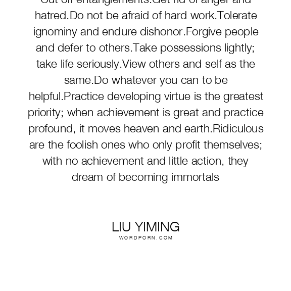 Cut off entanglements.Get rid of anger and hatred.Do not be afraid of hard work.Tolerate ignominy and endure dishonor.Forgive people and defer to others.Take possessions lightly; take life seriously.View others and self as the same.Do whatever you can to be helpful.Practice developing virtue is the greatest priority; when achievement is great and practice profound, it moves heaven and earth.Ridiculous are the foolish ones who only profit themselves; with no achievement and little action, they dream of becoming immortals