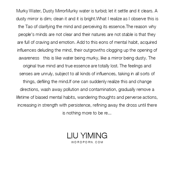 Murky Water, Dusty MirrorMurky water is turbid; let it settle and it clears. A dusty mirror is dim; clean it and it is bright.What I realize as I observe this is the Tao of clarifying the mind and perceiving its essence.The reason why people's minds are not clear and their natures are not stable is that they are full of craving and emotion. Add to this eons of mental habit, acquired influences deluding the mind, their outgrowths clogging up the opening of awareness - this is like water being murky, like a mirror being dusty. The original true mind and true essence are totally lost. The feelings and senses are unruly, subject to all kinds of influences, taking in all sorts of things, defiling the mind.If one can suddenly realize this and change directions, wash away pollution and contamination, gradually remove a lifetime of biased mental habits, wandering thoughts and perverse actions, increasing in strength with persistence, refining away the dross until there is nothing more to be refined away, when the slag is gone the gold is pure. The original mind and fundamental essence will spontaneously appear in full, the light of wisdom will suddenly arise, and one will clearly see the universe as though it were in the palm of the hand, with no obstruction.This is like murky water returning to clarity when settled, like a dusty mirror being restored to brightness when polished. That which is fundamental is as ever: without any lack