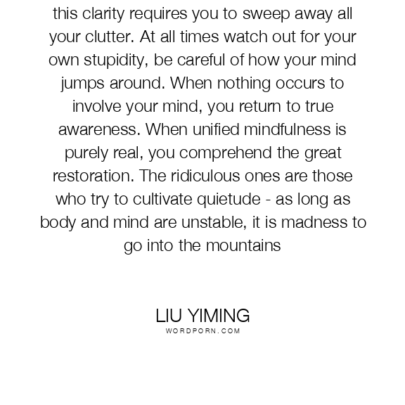 Stupidity and MadnessThe Tao is clear, yet this clarity requires you to sweep away all your clutter. At all times watch out for your own stupidity, be careful of how your mind jumps around. When nothing occurs to involve your mind, you return to true awareness. When unified mindfulness is purely real, you comprehend the great restoration. The ridiculous ones are those who try to cultivate quietude - as long as body and mind are unstable, it is madness to go into the mountains