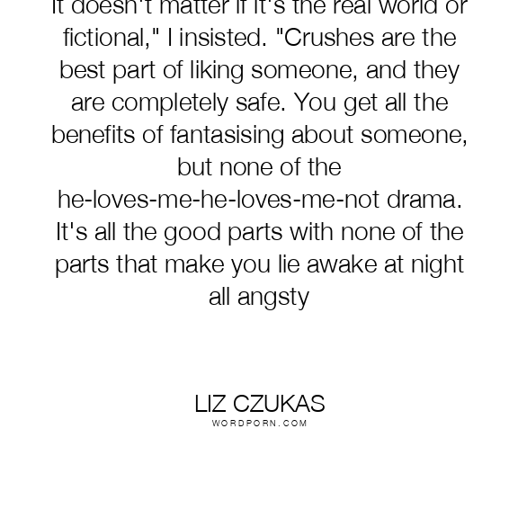 It doesn't matter if it's the real world or fictional," I insisted. "Crushes are the best part of liking someone, and they are completely safe. You get all the benefits of fantasising about someone, but none of the he-loves-me-he-loves-me-not drama. It's all the good parts with none of the parts that make you lie awake at night all angsty