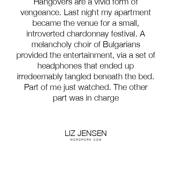 Hangovers are a vivid form of vengeance. Last night my apartment became the venue for a small, introverted chardonnay festival. A melancholy choir of Bulgarians provided the entertainment, via a set of headphones that ended up irredeemably tangled beneath the bed. Part of me just watched. The other part was in charge