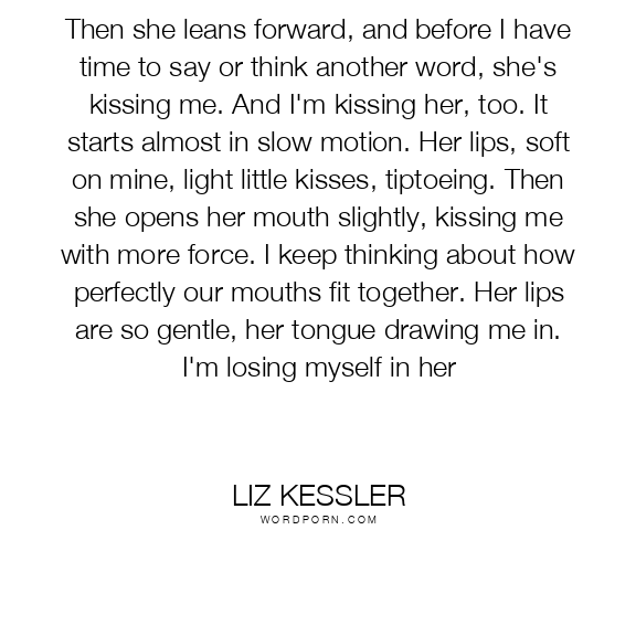 Then she leans forward, and before I have time to say or think another word, she's kissing me. And I'm kissing her, too. It starts almost in slow motion. Her lips, soft on mine, light little kisses, tiptoeing. Then she opens her mouth slightly, kissing me with more force. I keep thinking about how perfectly our mouths fit together. Her lips are so gentle, her tongue drawing me in. I'm losing myself in her