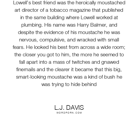 Lowell’s best friend was the heroically moustached art director of a tobacco magazine that published in the same building where Lowell worked at plumbing. His name was Harry Balmer, and despite the evidence of his moustache he was nervous, compulsive, and wracked with small fears. He looked his best from across a wide room; the closer you got to him, the more he seemed to fall apart into a mass of twitches and gnawed finernails and the clearer it became that this big, smart-looking moustache was a kind of bush he was trying to hide behind