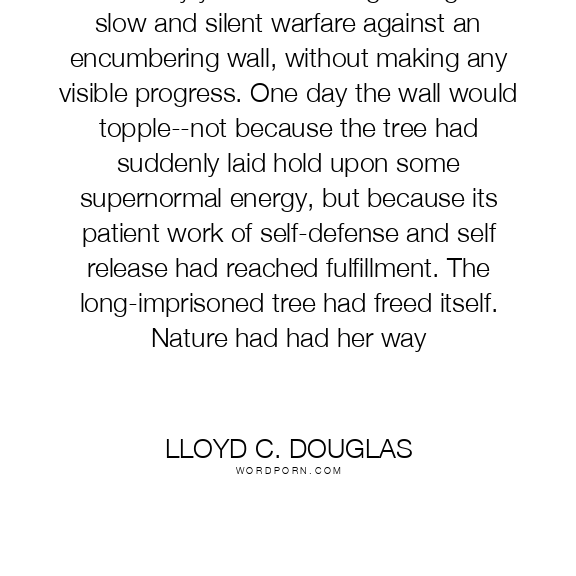 For many years a tree might wage a slow and silent warfare against an encumbering wall, without making any visible progress. One day the wall would topple--not because the tree had suddenly laid hold upon some supernormal energy, but because its patient work of self-defense and self release had reached fulfillment. The long-imprisoned tree had freed itself. Nature had had her way