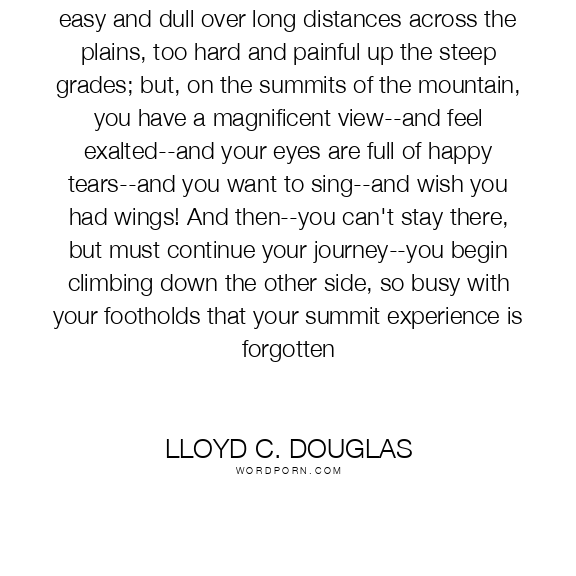 Our life is like a land journey, too even and easy and dull over long distances across the plains, too hard and painful up the steep grades; but, on the summits of the mountain, you have a magnificent view--and feel exalted--and your eyes are full of happy tears--and you want to sing--and wish you had wings! And then--you can't stay there, but must continue your journey--you begin climbing down the other side, so busy with your footholds that your summit experience is forgotten