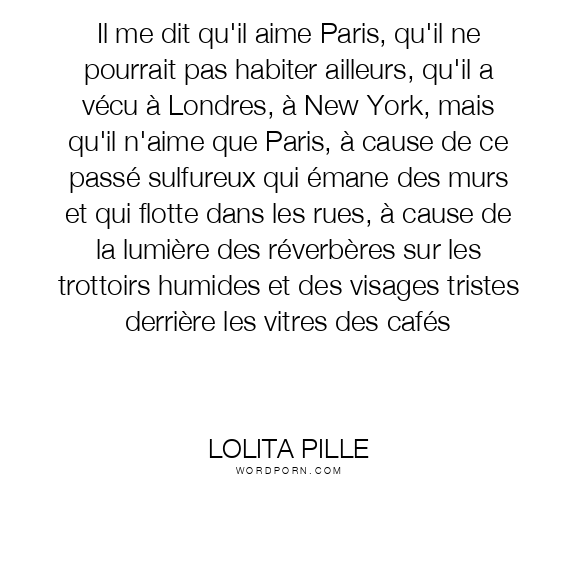 Il me dit qu'il aime Paris, qu'il ne pourrait pas habiter ailleurs, qu'il a vécu à Londres, à New York, mais qu'il n'aime que Paris, à cause de ce passé sulfureux qui émane des murs et qui flotte dans les rues, à cause de la lumière des réverbères sur les trottoirs humides et des visages tristes derrière les vitres des cafés