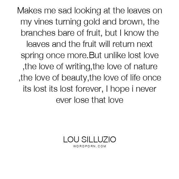 Makes me sad looking at the leaves on my vines turning gold and brown, the branches bare of fruit, but I know the leaves and the fruit will return next spring once more.But unlike lost love ,the love of writing,the love of nature ,the love of beauty,the love of life once its lost its lost forever, I hope i never ever lose that love