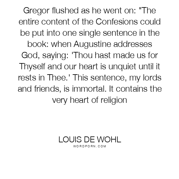 Gregor flushed as he went on: "The entire content of the Confesions could be put into one single sentence in the book: when Augustine addresses God, saying: 'Thou hast made us for Thyself and our heart is unquiet until it rests in Thee.' This sentence, my lords and friends, is immortal. It contains the very heart of religion